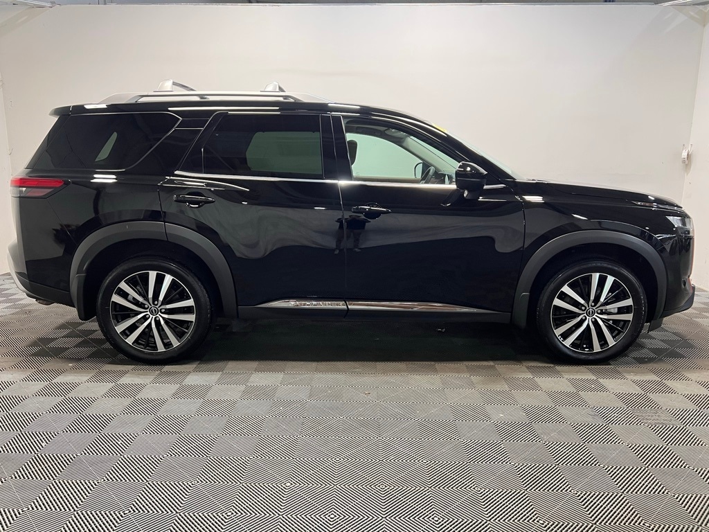 Pathfinder Platinum, 13 Speakers, 3rd row seats: bench, 4-Wheel Disc Brakes, ABS brakes, Air Conditioning, Alloy wheels, AM/FM radio: SiriusXM, Auto High-beam Headlights, Auto tilt-away steering wheel, Auto-dimming Rear-View mirror, Automatic temperature control, Axle Ratio: 4.334, Bench Seat Carpeted Floor Mats (Set of 4), Black Splash Guards (Set of 4), Bodyside moldings, Bose Premium Audio System, Brake assist, Bumpers: body-color, Cargo Area Protector, Cargo Package, Cross Bars, Delay-off headlights, Driver door bin, Driver vanity mirror, Dual front impact airbags, Dual front side impact airbags, Electronic Stability Control, Emergency communication system, Exterior Parking Camera Rear, Four wheel independent suspension, Front anti-roll bar, Front Bucket Seats, Front Center Armrest, Front dual zone A/C, Front reading lights, Fully automatic headlights, Garage door transmitter: HomeLink, Heads-Up Display, Heated & Cooled Front Bucket Seats, Heated door mirrors, Heated front seats, Heated rear seats, Heated steering wheel, Illuminated entry, Knee airbag, Leather steering wheel, Low tire pressure warning, Memory seat, Navigation system: NissanConnect with Navigation and Services, NissanConnect featuring Apple CarPlay and Android Auto, NissanConnect w/Navigation & Services, Occupant sensing airbag, Outside temperature display, Overhead airbag, Overhead console, Panic alarm, Passenger door bin, Passenger vanity mirror, Power door mirrors, Power driver seat, Power Liftgate, Power moonroof, Power passenger seat, Power steering, Power windows, Radio data system, Radio: AM/FM Audio System, Rain sensing wipers, Rear air conditioning, Rear anti-roll bar, Rear reading lights, Rear seat center armrest, Rear side impact airbag, Rear window defroster, Rear window wiper, Reclining 3rd row seat, Remote keyless entry, Security system, Semi-Aniline Leather-Appointed Seating Surfaces, Speed control, Speed-sensing steering, Speed-Sensitive Wipers, Split folding rear seat, Spoiler, Steering wheel memory, Steering wheel mounted audio controls, Tachometer, Telescoping steering wheel, Tilt steering wheel, Traction control, Trip computer, Turn signal indicator mirrors, Variably intermittent wipers, Ventilated front seats, Wheels: 20" x 8J Machined Alloy, Pathfinder Platinum.