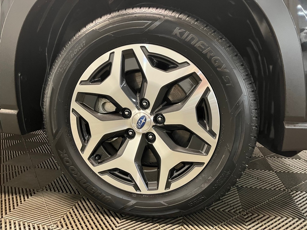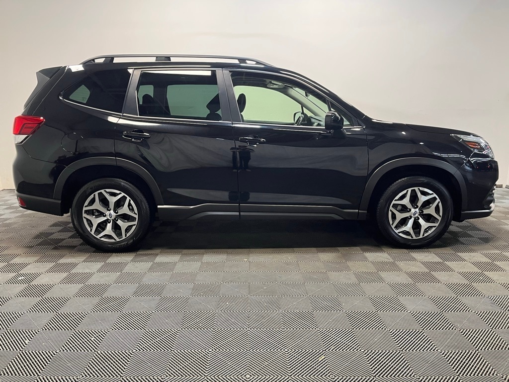 Forester Premium, 3.70 Axle Ratio, 4-Wheel Disc Brakes, 6 Speakers, ABS brakes, Air Conditioning, All-Weather Floor Liners, Alloy wheels, AM/FM radio: SiriusXM, Anti-whiplash front head restraints, Auto High-beam Headlights, Automatic temperature control, Blind Spot Detection (BSD), Blind Spot Detection w/RCTA & Power Rear Gate, Brake assist, Bumpers: body-color, CD player, Driver door bin, Driver vanity mirror, Driver's Seatback Divided Pocket, Dual front impact airbags, Dual front side impact airbags, Dual USB Charge Ports, Electronic Stability Control, Emergency communication system: STARLINK Safety and Security (Subscription Required), Exterior Parking Camera Rear, EyeSight System, Four wheel independent suspension, Front anti-roll bar, Front Bucket Seats, Front Center Armrest, Front fog lights, Front reading lights, Fully automatic headlights, Heated door mirrors, Heated Front Bucket Seats, Heated front seats, Illuminated entry, Knee airbag, Low tire pressure warning, Multi-Function High Grade Display, Occupant sensing airbag, Outside temperature display, Overhead airbag, Overhead console, Panic alarm, Passenger door bin, Passenger vanity mirror, Power door mirrors, Power driver seat, Power moonroof: Panoramic, Power Rear Gate, Power steering, Power windows, Premium Cloth Upholstery, Radio data system, Radio: Subaru Starlink 6.5" Multimedia Plus System, Rear anti-roll bar, Rear seat center armrest, Rear Seatback Protector, Rear window defroster, Rear window wiper, Remote keyless entry, Roof rack: rails only, Security system, Speed control, Speed-sensing steering, Split folding rear seat, Spoiler, STARLINK/Apple CarPlay/Android Auto, Steering wheel mounted audio controls, Tachometer, Telescoping steering wheel, Tilt steering wheel, Traction control, Trip computer, Variably intermittent wipers, Wheels: 17" x 7.0J Black Machine Finish Alloy, Forester Premium.